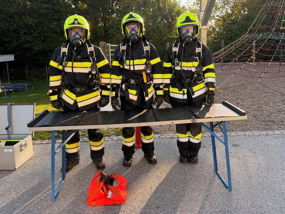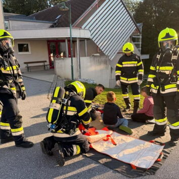 Vor den Kindern errichteten wir einen SAN-Platz sowie den ATS-Platz, damit sie miterleben konnten, wie die geretteten Kinder im Ernstfall erstversorgt würden. Besonders wichtig war es uns auch, nach Abschluss der Übung die Atemschutzausrüstung vor den Kindern abzulegen, damit sie sehen konnten, dass sich darunter bekannte Gesichter – wie etwa Mama oder Papa von MitschülerInnen – verbergen.