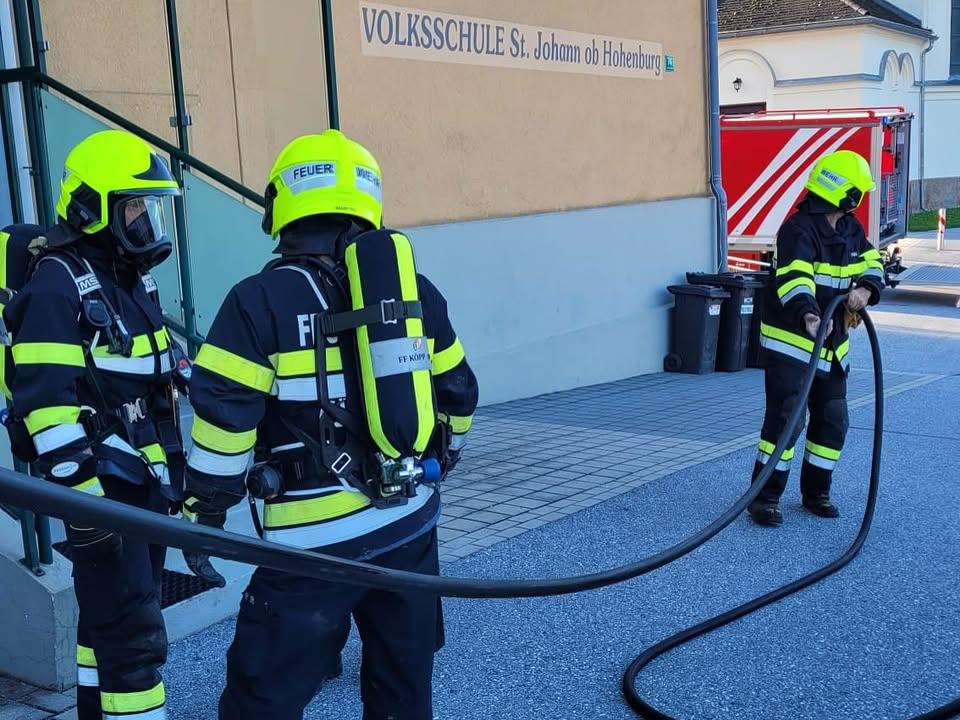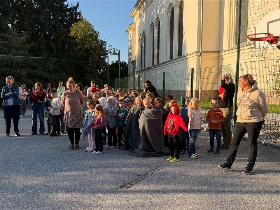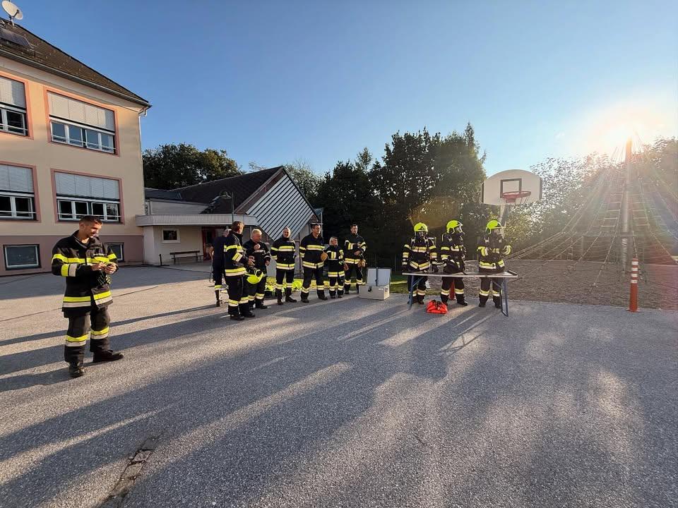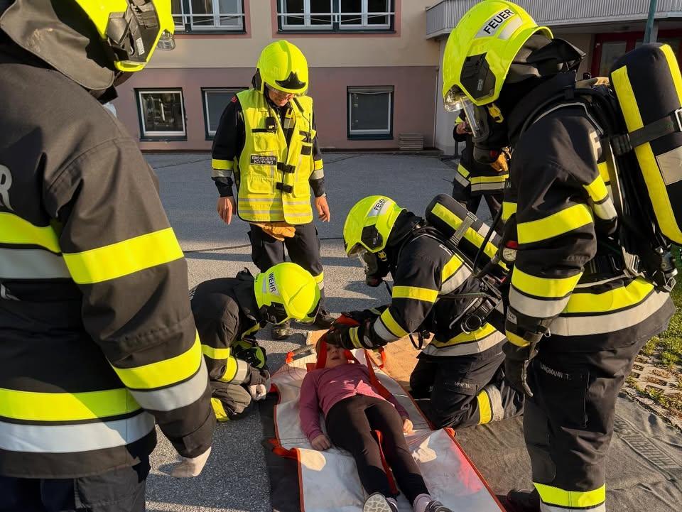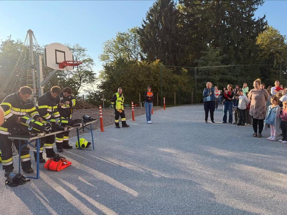 Pünktlich um 8:00 Uhr löste die Direktorin den Brandalarm aus. Beim Eintreffen befanden sich die Kinder bereits klassenweise geordnet am Sammelplatz. Zwei Kinder wurden im Zuge der Übung von drei Atemschutzträgern „gerettet“.